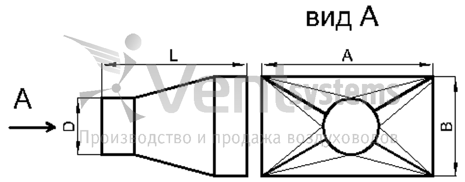 Данный переход стыкует прямоугольные воздуховоды с круглыми. Смещение является центральным.
