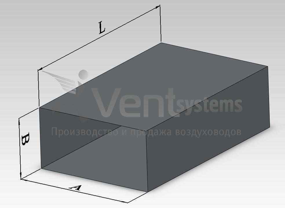 Основные характеристики воздуховода - это длина участка (на схемах обозначена буквой L), стороны сечения (обозначены буквами A и B), а также толщина стенок.